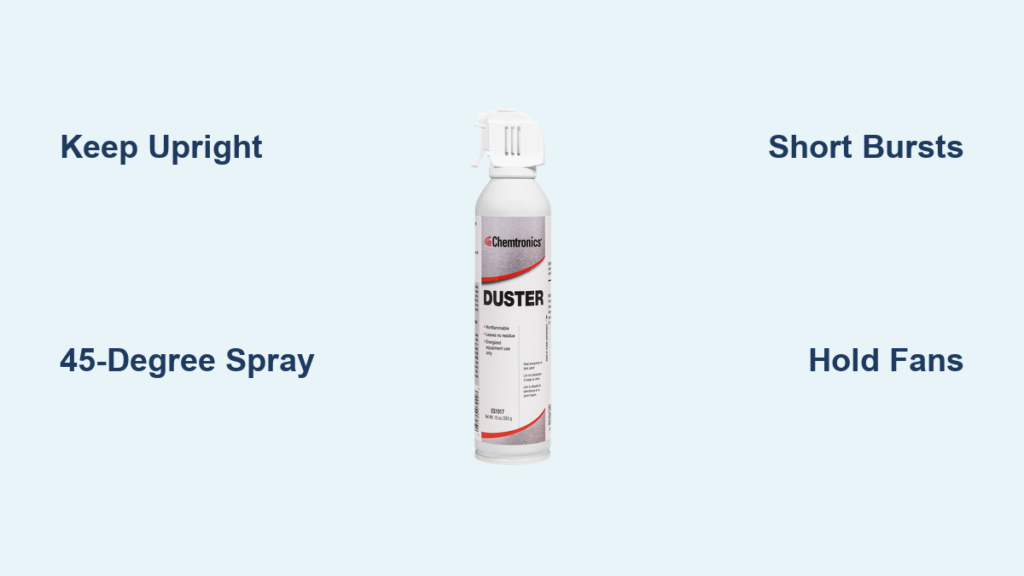 Mastering air duster how to use isn’t about speed—it’s about respecting the physics of compressed gas. By keeping cans upright, spraying at 45 degrees, and using surgical 2.5-second bursts, you’ll extend electronics lifespan by 3+ years. Remember: When frost forms on the can, stop immediately—your gear isn’t worth a trip to the ER. Clean every 90 days to prevent heat damage, and always store dusters below 77°F (25°C) to maintain propellant stability. Your next cleaning session should take 12 minutes max—set a timer to enforce safe burst intervals. Now go rescue that dusty gaming rig; your GPU will thank you.