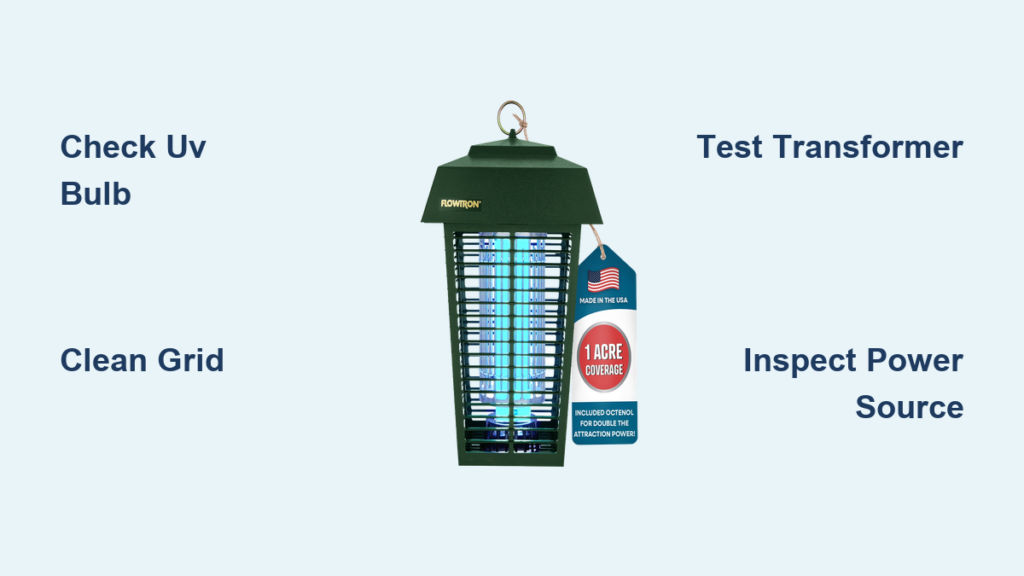 If your UV bulb isn’t glowing, skip straight to Phase 1 below. If the bulb lights but you hear no zap, focus on grid cleaning or transformer checks. This flowchart resolves 80% of “Flowtron bug zapper not working” cases before you even open the casing.