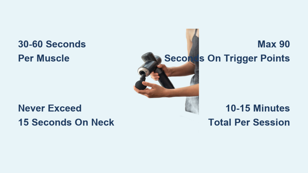 For isolated knots (like a shoulder “hot spot”), max 30-60 seconds of direct pressure. Technique matters: find the knot, reduce speed to level 2, hold static for 30 seconds. If no release, work the surrounding area for 45 seconds, then return for another 20 seconds. Never exceed 60 seconds total on one trigger point—this causes capillary rupture and bruising. You’ll know it’s working when the knot softens; if pain intensifies, stop. Pro tip: breathe deeply during application—holding your breath increases tissue tension.