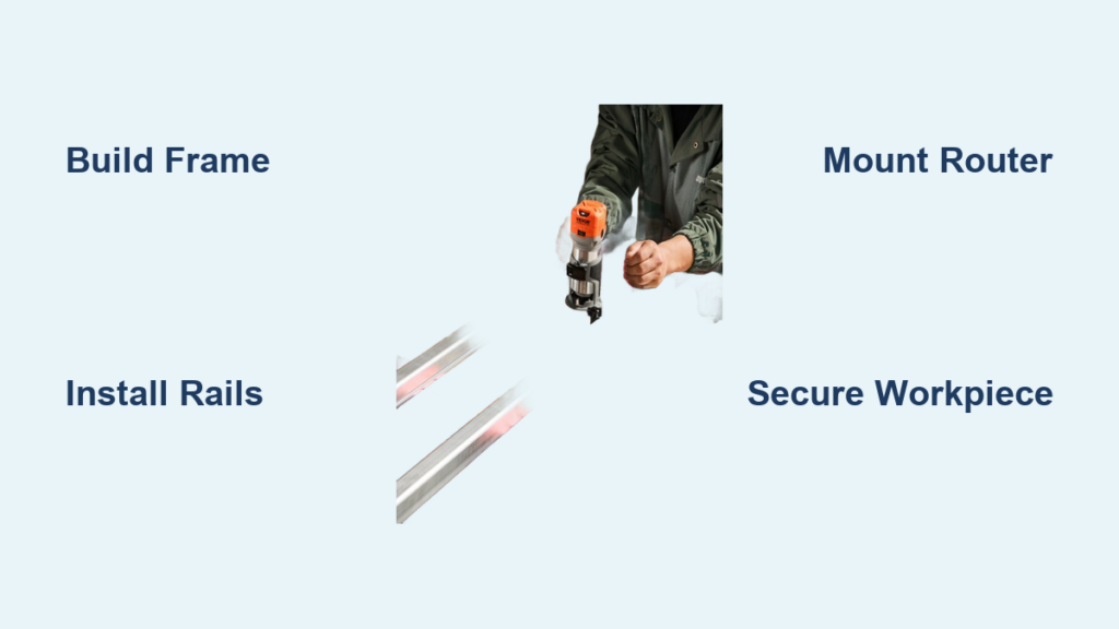 Create a router mounting plate from 1/2″ plywood cut to match your router base. Drill precise mounting holes, then attach this plate to your sled frame using T-track hardware. The critical step: ensure your router base sits perfectly perpendicular to the sled plane. Use a machinist’s square to verify 90-degree alignment before final tightening. This prevents uneven cuts and router wobble that cause surface imperfections.