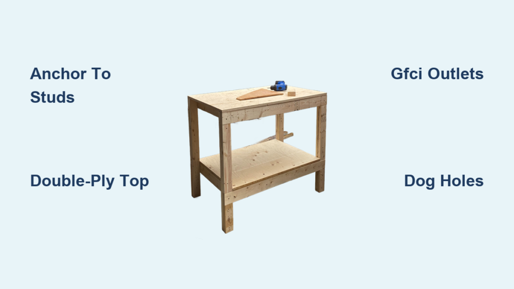 Why particleboard or single plywood fails in sheds: Humidity warps flat tops within months, while thin surfaces dent under vise pressure. Your top must resist moisture and support 300+ pounds of tools. Two field-tested solutions: