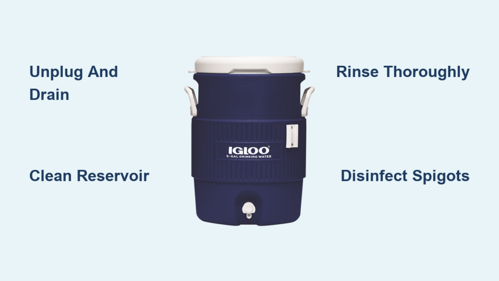 Before touching any cleaning solution, safety must come first when you tackle how to clean 5 gallon water cooler systems. Begin by unplugging the unit from the wall socket—this simple step prevents electrical hazards, especially important since you’ll be working with liquids near electrical components. If your cooler has separate switches for hot and cold functions, turn these off as well to ensure no accidental activation during cleaning.