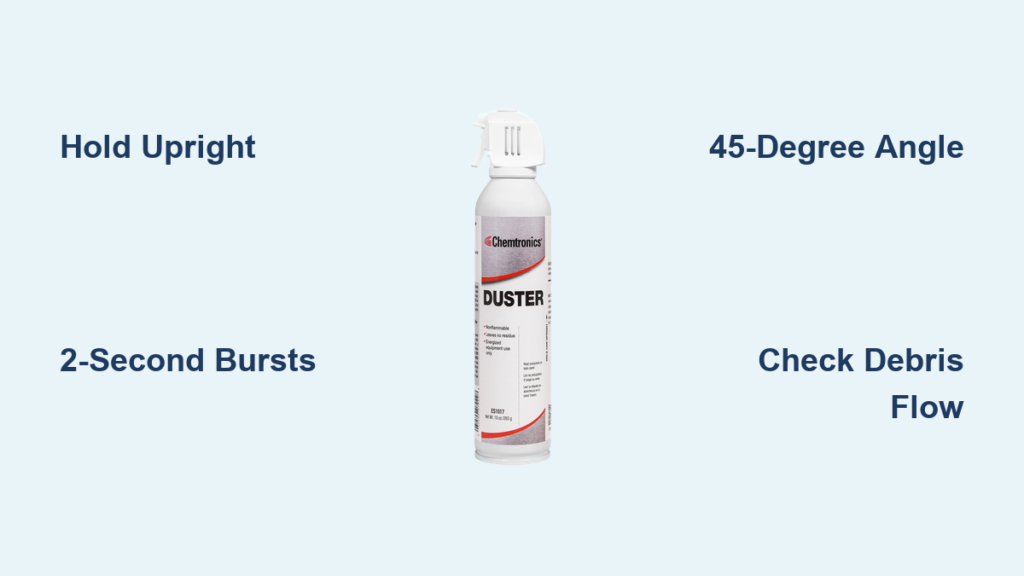 Hold the compressed air can perfectly upright—this is non-negotiable. Tilting beyond 20 degrees risks spraying liquid propellant that can freeze and damage internal components. Maintain a consistent 1-2 inch distance from keycaps and use 1-2 second bursts rather than continuous spraying. Start at the top right corner of your keyboard and work methodically leftward in rows, angling the nozzle between keys at 30-degree increments to reach all crevices.