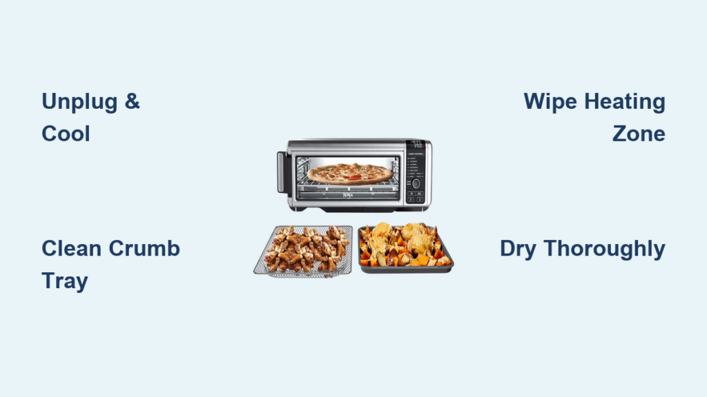 Slide out the crumb tray first—it catches burnt debris that smokes during next use. Lift the air fry basket straight up, wiggling gently if stuck from grease. If using the dehydrator rack or pizza pan, remove those too. Place components on a heat-proof surface like a silicone mat. Never soak accessories while the main unit is hot—sudden temperature shifts crack non-stick coatings.
