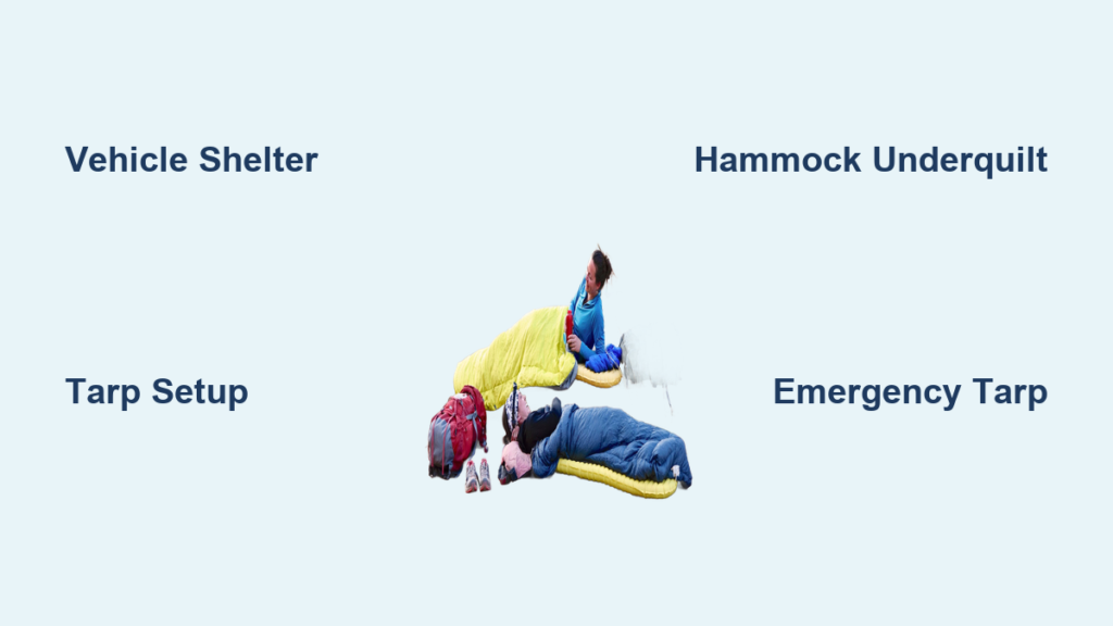 Camping without a tent isn’t about sacrificing comfort—it’s about smarter shelter choices. Your vehicle becomes a fortress with proper ventilation, while a $20 tarp outperforms tents in wind-driven rain. Remember: insulation from the ground (via high-R-value pads) matters more than overhead cover, and always have a bivy sack as your emergency shell. Start with car camping in familiar territory, master tarp setups in your backyard, and within months you’ll shed 15+ lbs of tent gear while sleeping drier and warmer. The next time you pack, leave the poles behind—but never skip the underquilt.