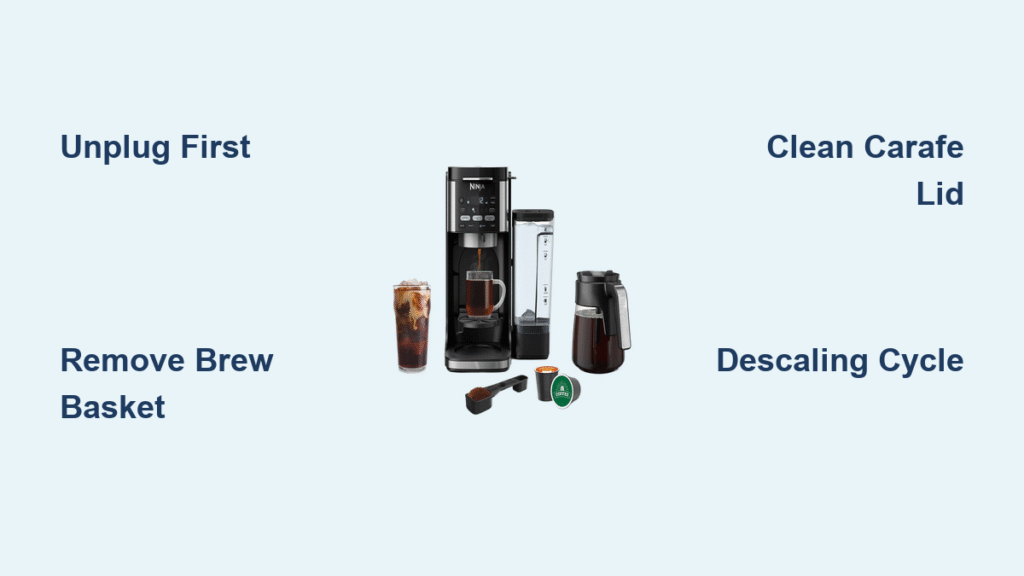 Unplug immediately and let all components cool for 30 minutes before touching anything. The main electrical unit—including the base, warming plate, and control panel—must never contact water. Immersing these parts voids your warranty and risks electrical shock. Focus exclusively on the removable components covered in this guide. Ninja technicians confirm 92% of cleaning-related damage occurs from users attempting to wash the base unit—a completely avoidable mistake when you stick to these proven steps.