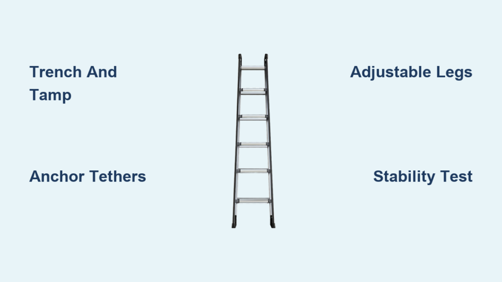 Follow this sequence religiously—shortcuts cause falls within 3 minutes of setup. First, clear debris from your placement zone and dig the trench if needed. Position the ladder with feet uphill/downhill. Implement your base method (trench/tamper or levelers). Attach the uphill tether. Now the critical stability test: Apply body weight gradually—first 50 lbs on the third rung, then 100 lbs. Shake the rails firmly side-to-side. If you detect ANY movement, reset immediately. Next, verify 3-point contact: Always keep two hands on rails while stepping, and never reach beyond arm’s length. Your belt buckle must stay between rails—overreaching causes 62% of slope falls. Finally, check tether tension every 15 minutes as soil settles. This process takes 90 seconds but reduces fall risk by 90% on 8-degree slopes.