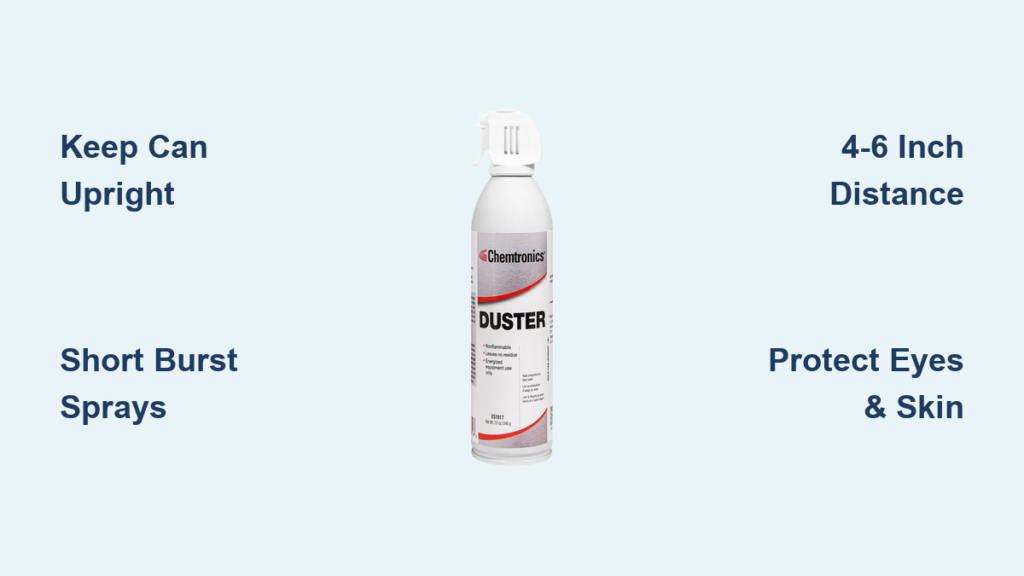 The rapid gas expansion creates dangerously cold temperatures at the nozzle. Direct contact with skin can cause frostbite in seconds, while eye exposure may lead to serious corneal damage. Always wear ANSI-approved safety goggles and keep the nozzle pointed away from your body. The American Academy of Ophthalmology documents multiple cases of eye injuries from improper air duster use—protection isn’t optional when working with these products.
