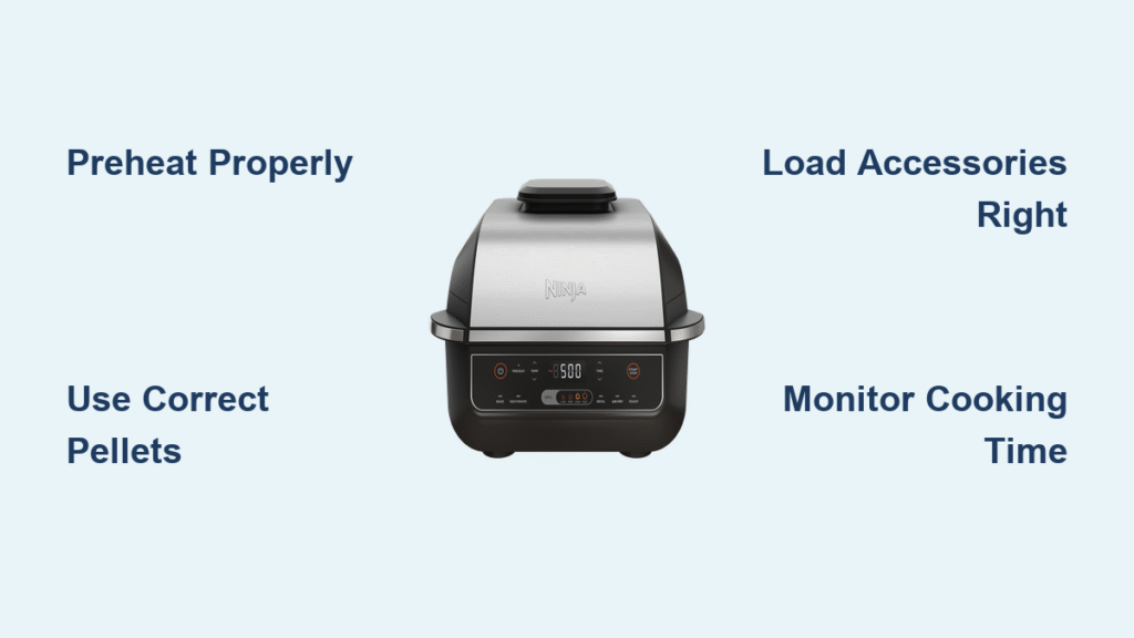 New Woodfire owners often ruin their first cook by using wood chips instead of pellets—this critical error produces bitter smoke and voids your warranty. Only use Ninja-approved wood pellets in the smoke box, never wood chips. For light smoke on delicate foods like chicken or fish, add just 2-3 tablespoons of pellets. Go heavy (a full scoop) for brisket or pork butt that needs intense smoke flavor. Load pellets before preheating—once the grill reaches temperature, press the Woodfire Flavor button to auto-ignite them. If you miss the ignition window, add more pellets and press the button again.