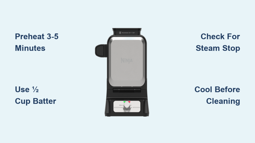 Since no preheating instructions exist for your Ninja model, use visual and auditory cues common to most waffle makers. Plug in the appliance and allow it to heat for approximately 3-5 minutes. Test readiness by carefully flicking a few water droplets onto the lower plate—the droplets should sizzle and evaporate almost immediately when properly preheated. Some users report that many modern waffle makers feature indicator lights that change color or turn off when preheated, so watch for any such signals during your initial testing phase.