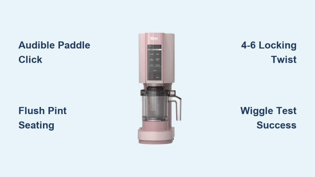 Reattach paddle with audible click → Reseat pint until flush → Twist lid with 4-6 motion