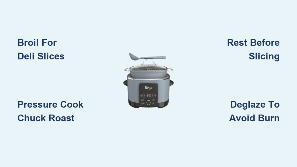 Your Ninja Foodi just became the secret weapon for roast beef that rivals your favorite deli—no oven smoke alarms, no thermometer anxiety. Picture this: a 3 lb top round emerging perfectly medium-rare after 25 minutes under the broiler, resting while you whip up au jus from the pan fond. Or chuck roast so tender it collapses at the fork’s touch, swimming in rich gravy made in the same pot. This Ninja Foodi roast beef recipe guide cuts through the confusion with four battle-tested methods, each tailored to your cut and craving. You’ll learn why skipping the tempering step guarantees gray edges, how to dodge “Burn” messages, and why resting time isn’t optional.